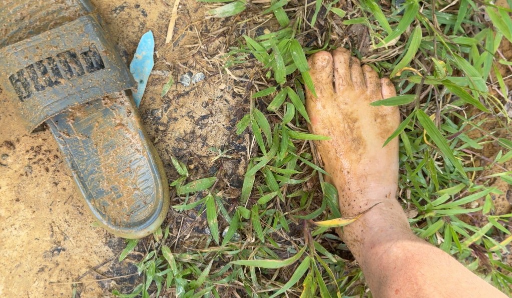 Die Fahrt war etwas abenteuerlich. Der letzte Abschnitt der Strecke war nicht befestigt und noch sehr schlammig. Wir mussten vom TukTuk öfter absteigen, weil wir im Schlamm stecken geblieben sind. Dabei bin ich bis zu den Waden im Schlamm versunken und ich hatte Schwierigkeiten meine Latschen aus dem Schlamm zu befreien.