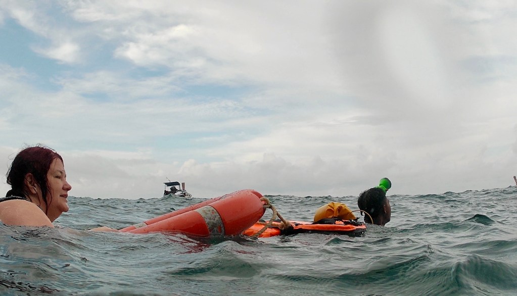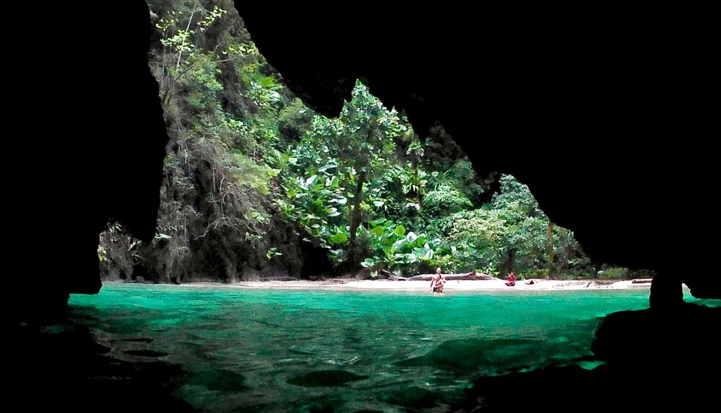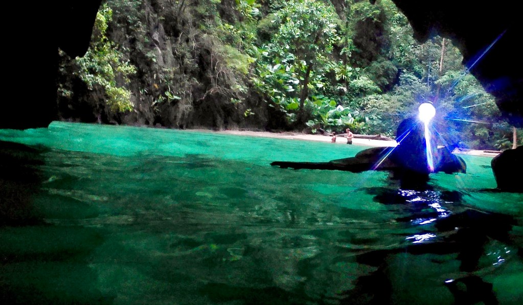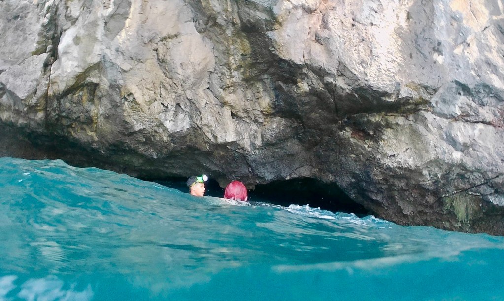 Wir fragten uns, warum das Boot so weit entfernt geparkt wurde. Schon der Weg zum Höhleneingang war anspruchsvoll. Im Meer zu schwimmen ist etwas anderes als im Pool zu planschen. Die Wellen haben den Eingang immer wieder verschlossen, sodass wir den richtigen Zeitpunkt abpassen mussten um in die Höhle zu gelangen. Dann drinnen, wurde es plötzlich schwarz um uns herum. Nur die Stirnlampe des Guide leuchtete ein wenig. Wir folgten dem Licht in die Höhle rein. Es ging auch um mehrere Ecken und teilweise wurde die Höhle sehr niedrig. An den niedrigen Stellen mussten wir die Wellenbewegung abpassen um nicht mit dem Kopf anzuschlagen. An manchen Stellen musste man auch mit dem Kopf unter Wasser und mit den Händen über dem Kopf sich an der Höhlendecke lang tasten. Der Weg durch die Höhle soll 80 Meter lang sein. Uns kam es länger vor.