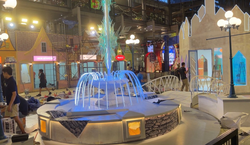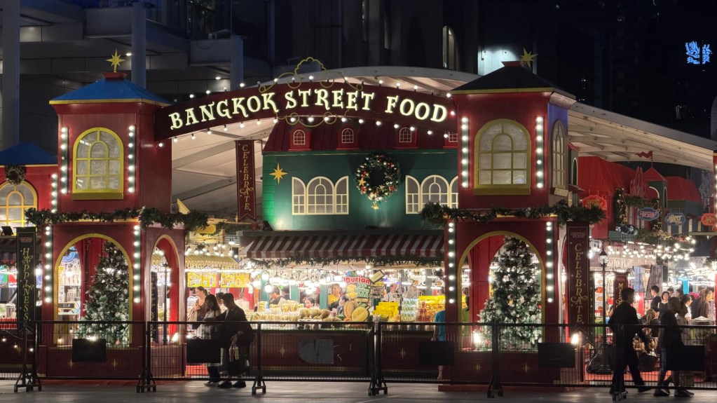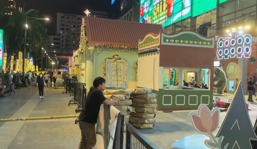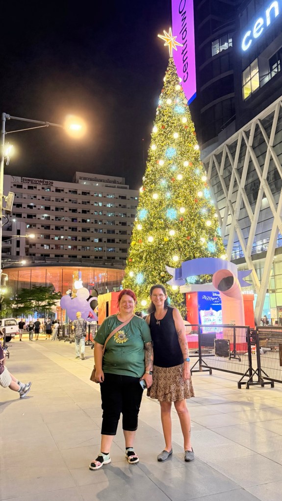 Dann noch kurz zur Siam-Station gefahren, um die abendliche Stimmung zu genießen. Und wir wurden von dem, was da gerade aufgebaut wurde überrascht. Bauen die doch da glatt einen Weihnachtsmarkt auf. 20 Uhr, 30 Grad und voll schwül und da steht ein Weihnachtsbaum.