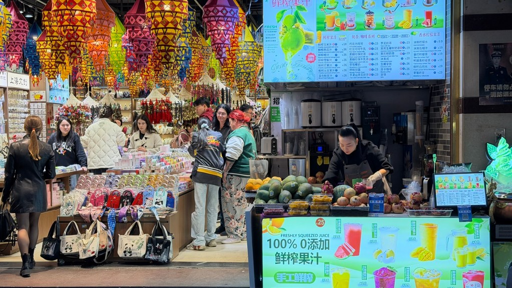 Eigentlich wollten wir anschließend zum Yu-Garden. Dies soll ein schön angelegter Park im chinesischen Style sein. Aber der hat Montags geschlossen. Schade. Als Alternative sind wir zur Nanjing Road, der Shopping Street hier in Shanghai gegangen. Bis auf ein paar architektonischer Besonderheiten und etwas andere Restaurants mit uns größtenteils unbekannten Speisen, ist jede Shopping Meile gleich. Wer Shopping mag, kann es eventuell gut finden.