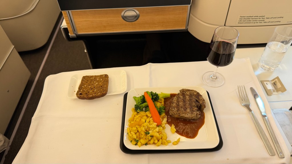 Das Essen an Board war wirklich gut. Auch die Getränkekarte war vielseitig. So habe ich mir vor dem Essen ein Schweizer Bier bestellt und zur Vorspeise gab es einen Schweizer Weißwein und zum Steak ein Schweizer Rotwein. Wusste nicht mal, das es Schweizer Wein gibt.