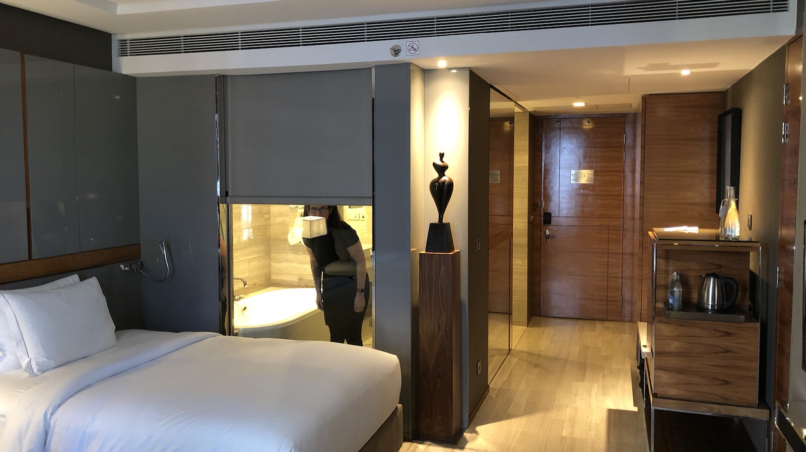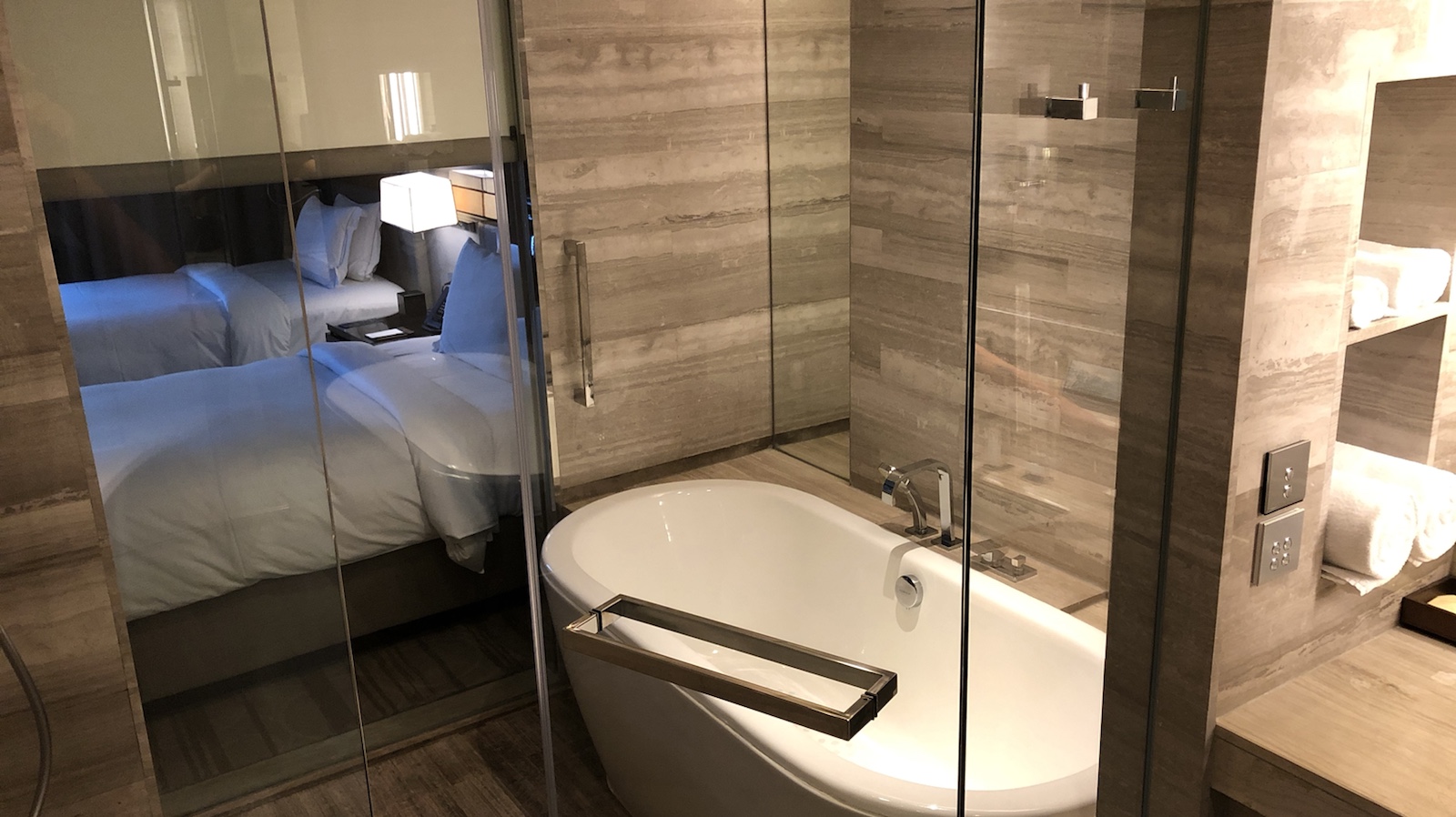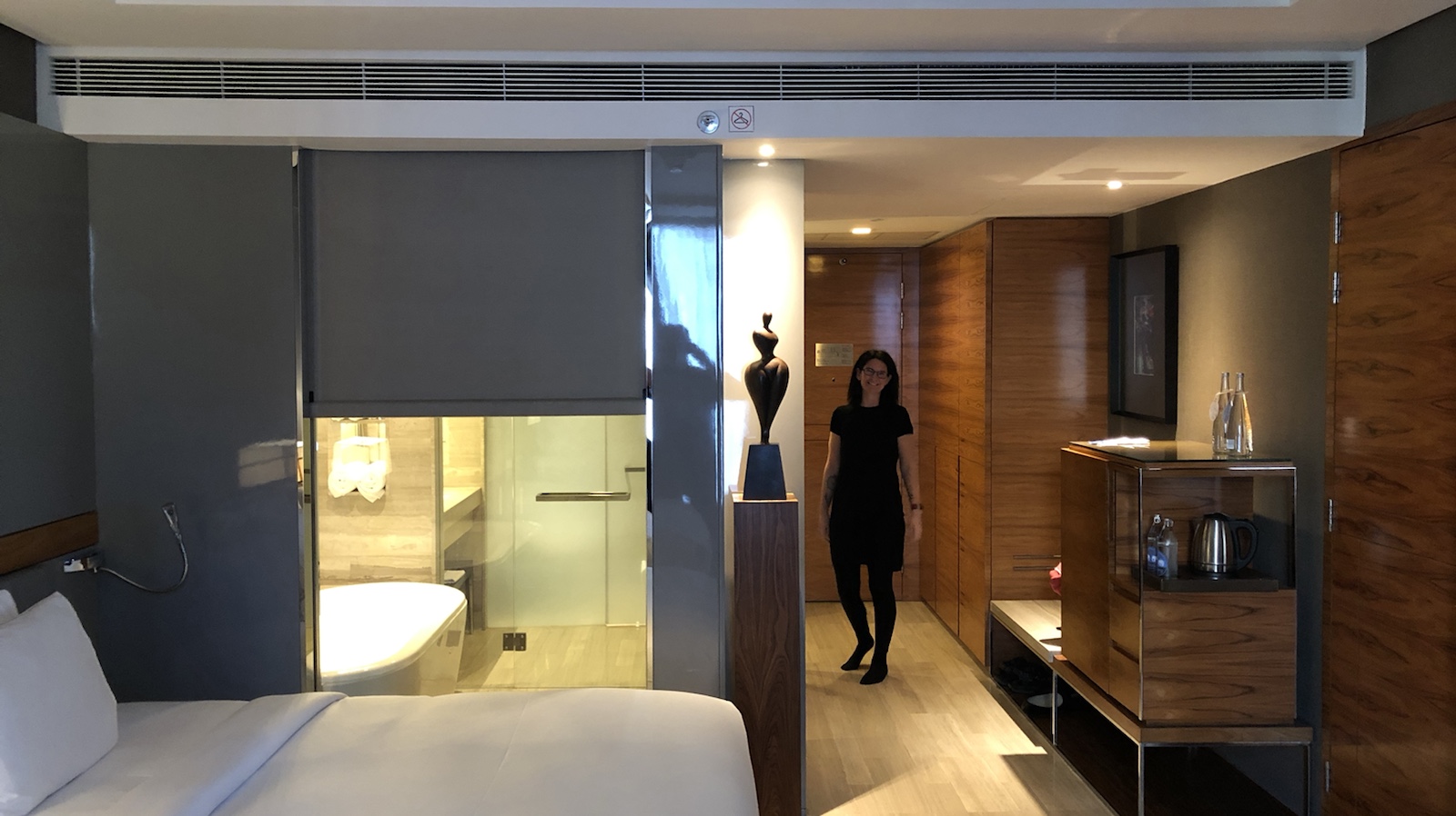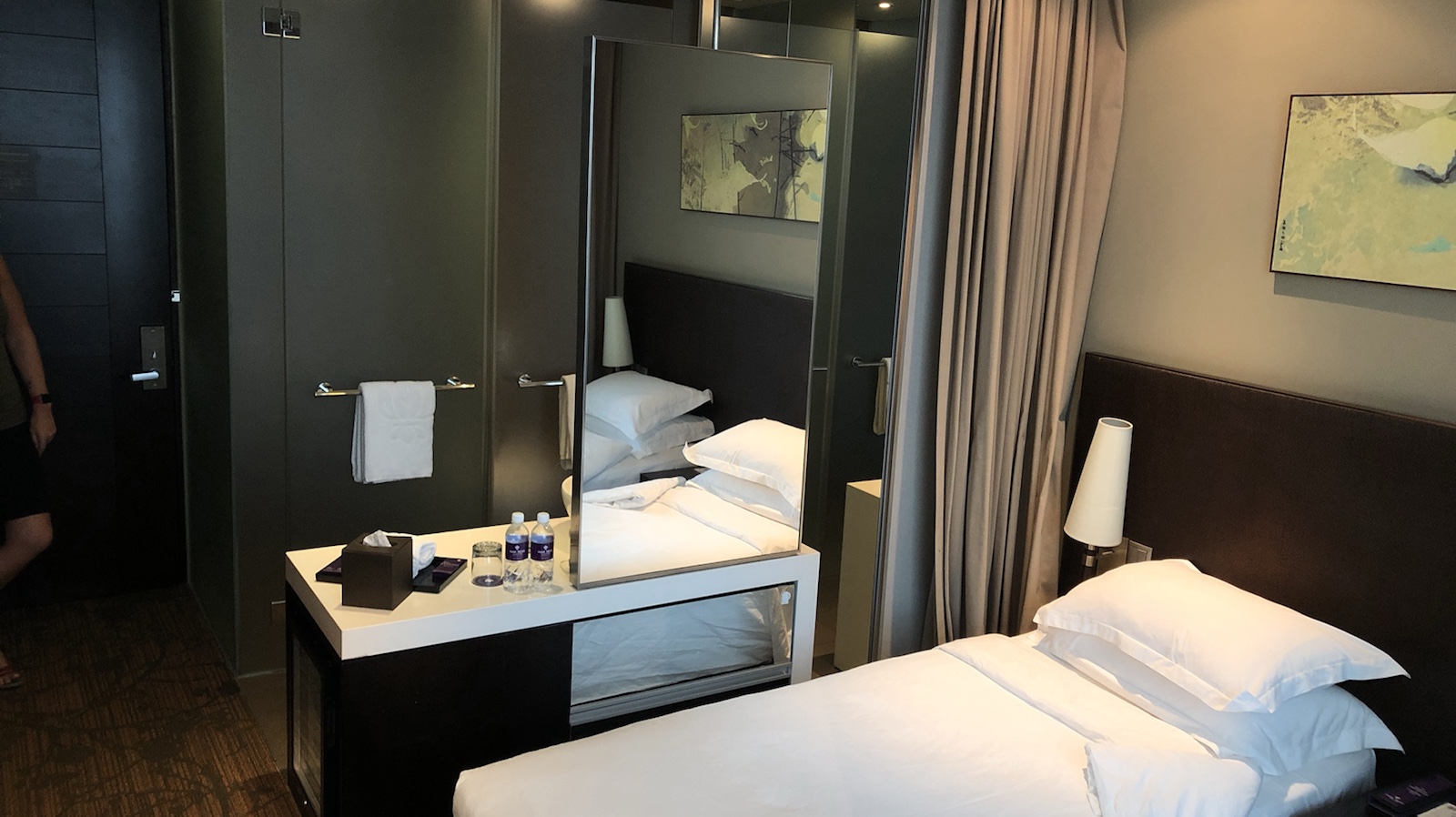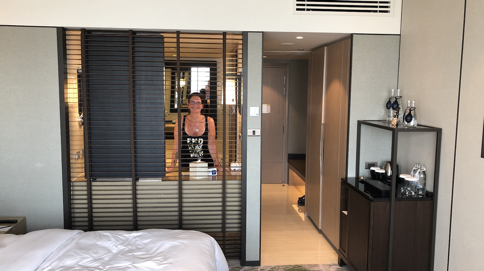 Wir haben über Miles & More Das Park Regis Hotel gebucht. Da gab es besonders viele Meilen gutgeschrieben. Das Zimmer ist aber recht gewöhnungsbedürftig. In das Zimmer sind 2 Milchglas-Boxen eingebaut, die als Dusche und Toilette dienen. Durch einen Spiegel und einem Vorhang sind diese vom Bett getrennt.