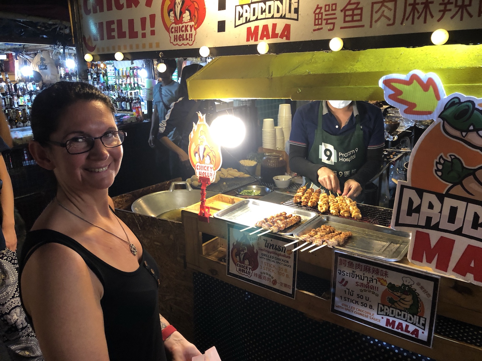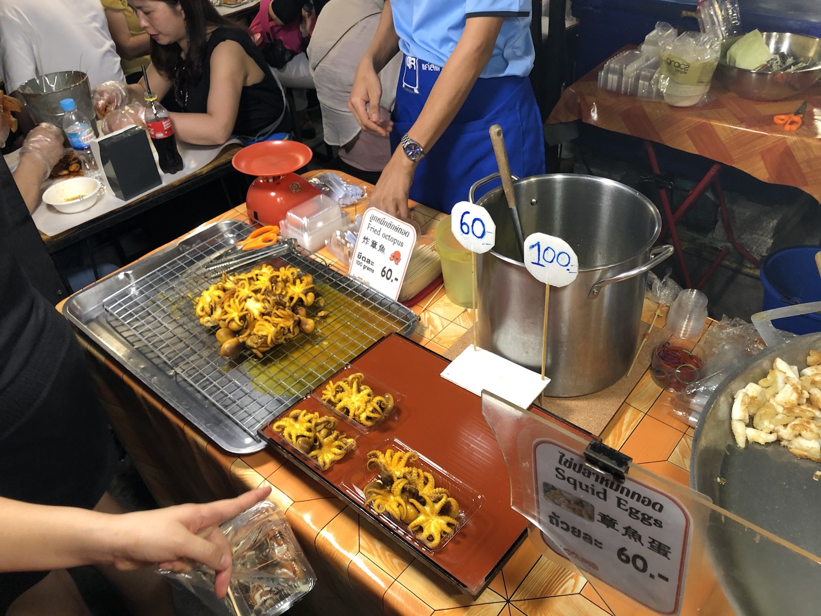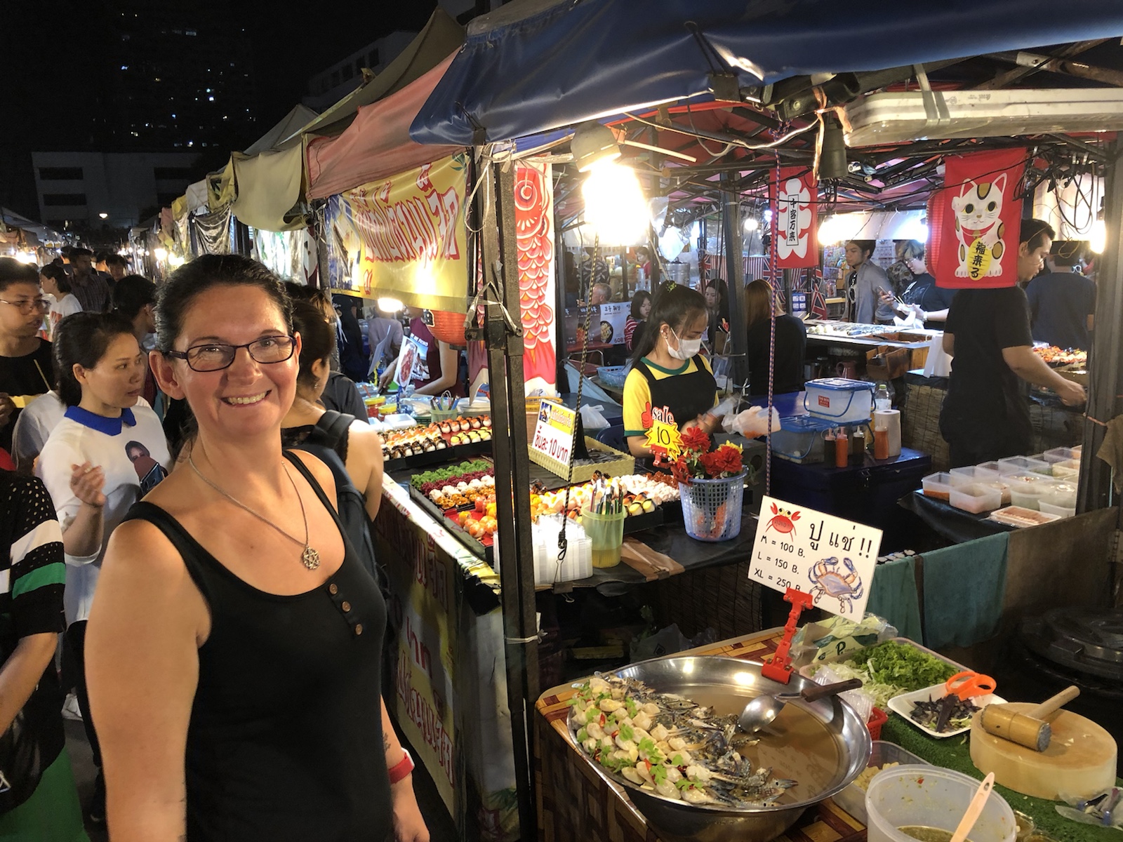Am Abend sind wir dann zu einem bekannten Nachtmarkt gefahren. Den Train Night Market Ratchada. Es war voll und heiß. Es schieben sich Massen von Touristen und Einheimische durch die engen Gassen und links und rechts wird gegrillt und gekocht. Einerseits möchte man da bleiben und alles probieren, anderseits möchte man nur raus um ein kühles Lüftchen zu ergattern. Wir haben uns den Spaß eine Stunde gegönnt aber eine Garküche am Straßenrand ist uns lieber.