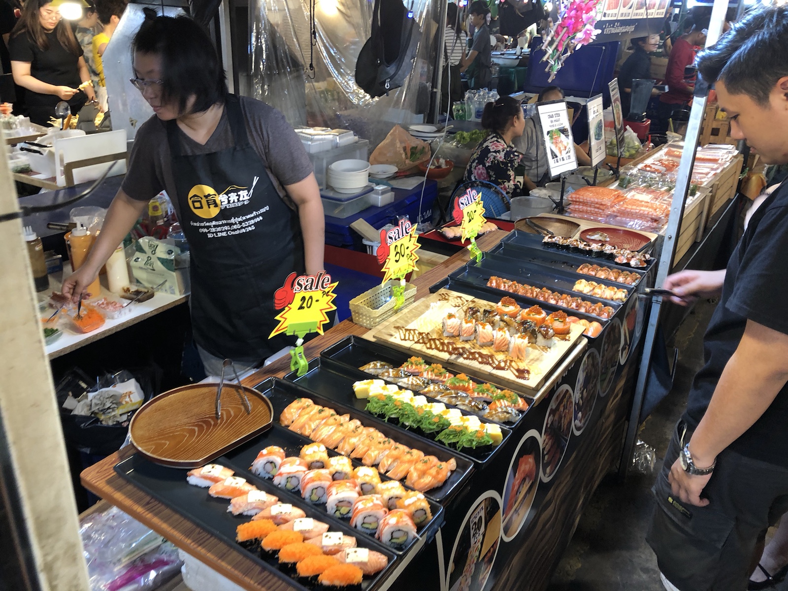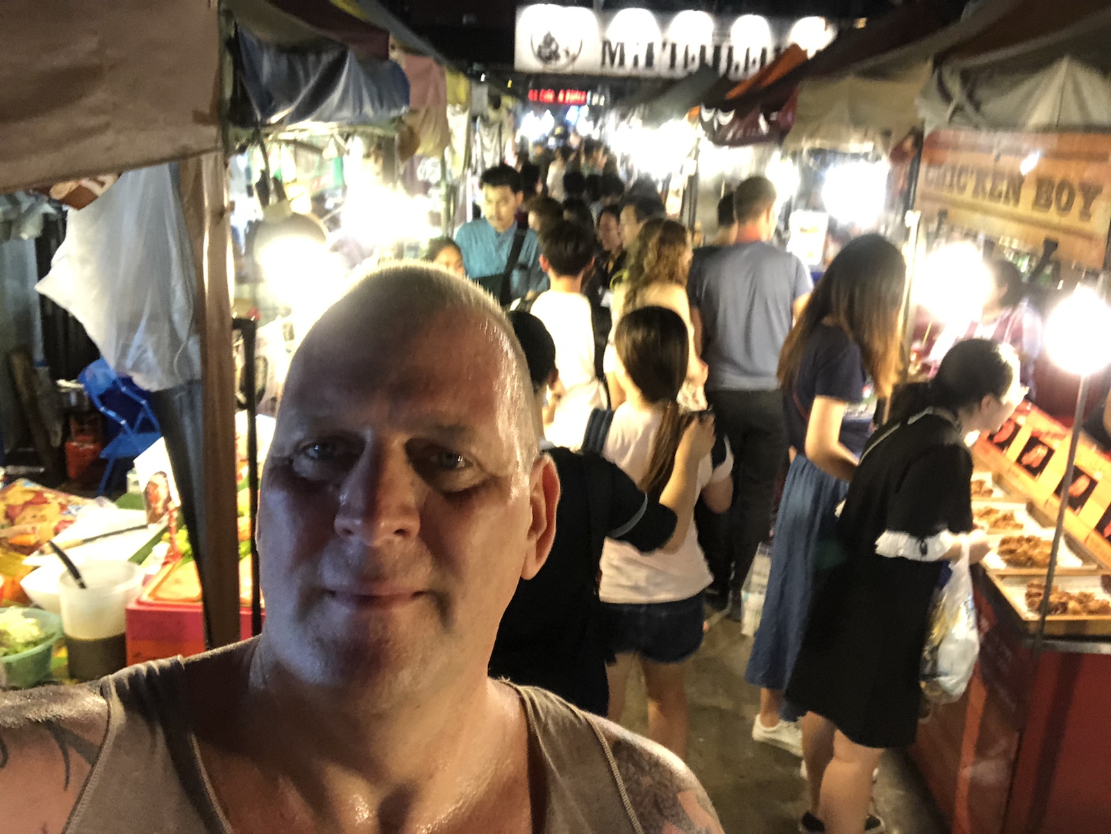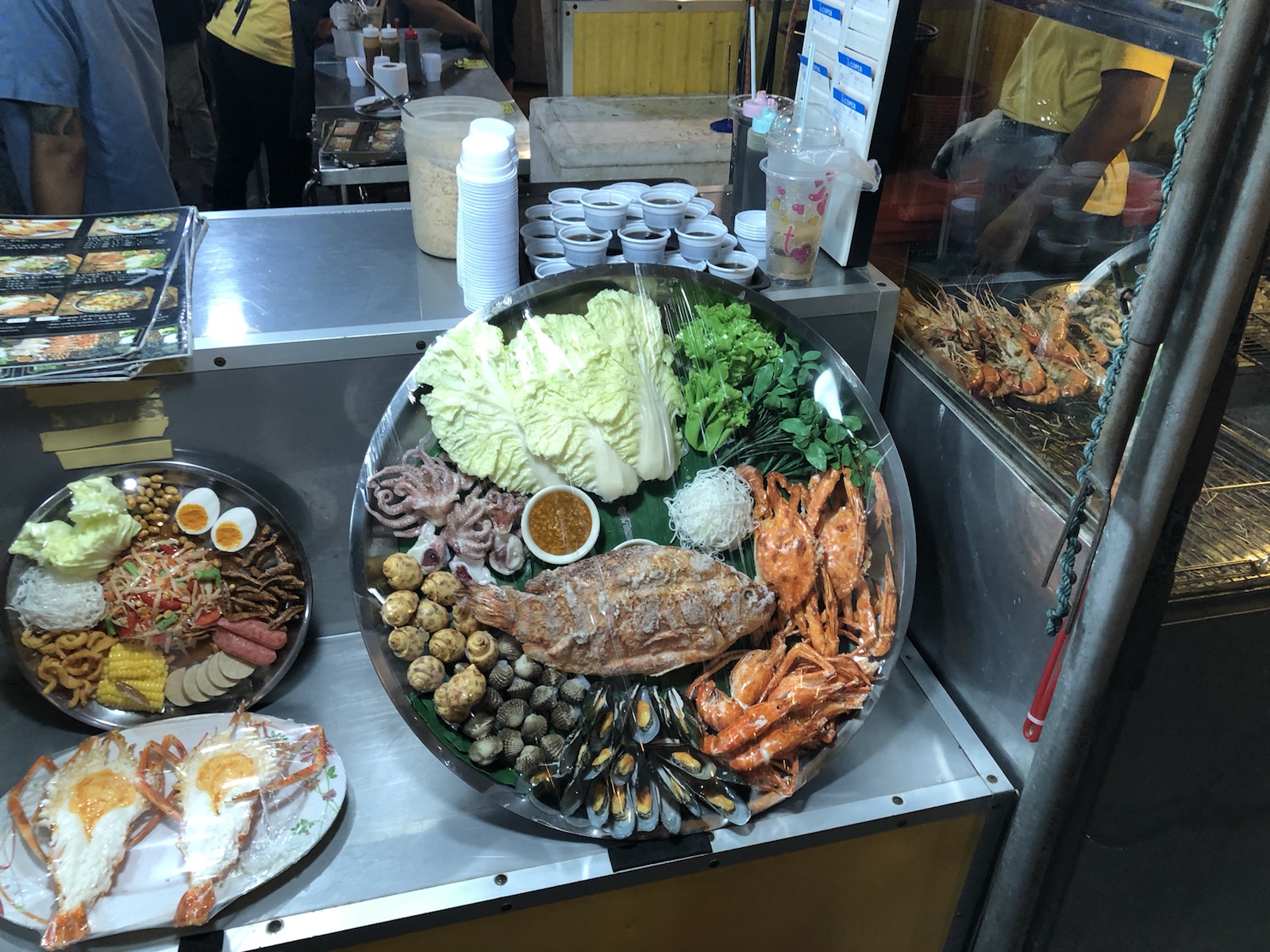 Am Abend sind wir dann zu einem bekannten Nachtmarkt gefahren. Den Train Night Market Ratchada. Es war voll und heiß. Es schieben sich Massen von Touristen und Einheimische durch die engen Gassen und links und rechts wird gegrillt und gekocht. Einerseits möchte man da bleiben und alles probieren, anderseits möchte man nur raus um ein kühles Lüftchen zu ergattern. Wir haben uns den Spaß eine Stunde gegönnt aber eine Garküche am Straßenrand ist uns lieber.