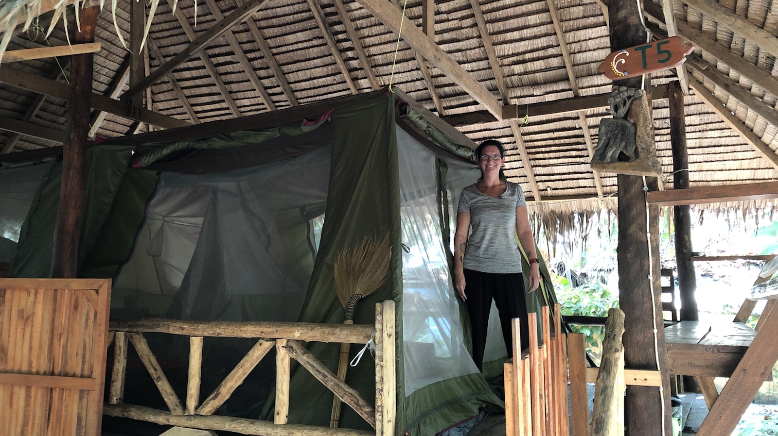 Auf der Insel angekommen wurden wir gleich von den Mopedtaxis abgefangen. Autos gibt es nicht also 3 Mopeds gebucht. Zwei für uns und eines für das Gepäck. Nach circa 10 Minuten Fahrt sind wir am JJ Bungalows, am Ao Yai Beach angekommen. Wir hatten uns vorab ein Zelt reserviert. Ja richtig gelesen, wir in einem Zelt. Das ist ein krasser Schnitt. Vom Hilton zum Zelt. Das Zelt ist relativ groß und ist vielleicht hier besser zum übernachten geeignet wie ein Bungalow. Es gibt auf der Insel wenige Bungalows mit Klimaanlage und diese sind sehr teuer. Ein Zelt kühlt schneller ab in der Nacht. Mal sehen ob die Theorie auch in der Praxis funktioniert. Wir