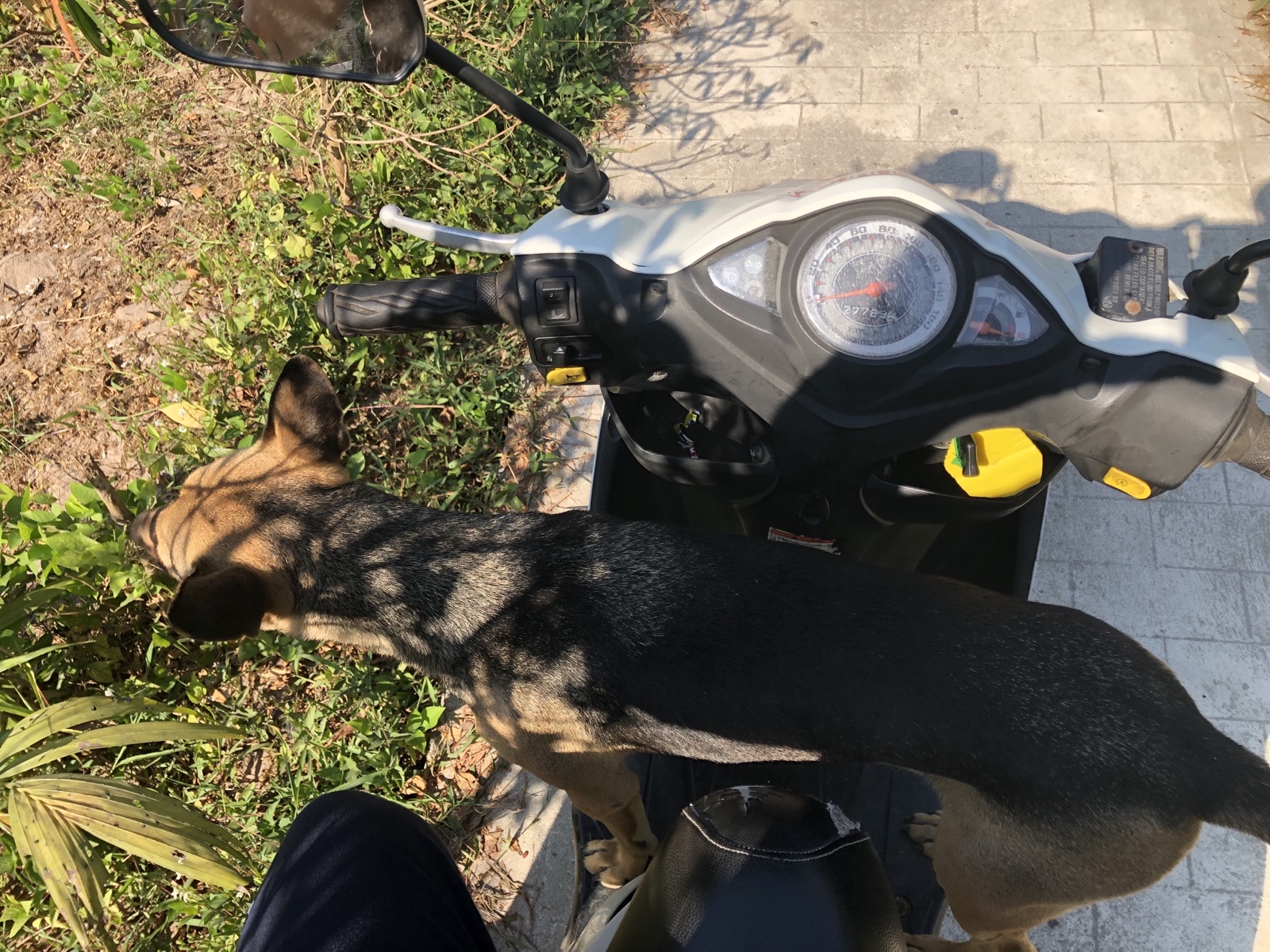 Am Nachmittag wollte ich dann das Moped zurück bringen. Eigentlich ein ganz normaler Vorgang hier. Außer wenn ich das mache. Das Moped stand auf dem Parkplatz der Anlage. Zu der Anlage führt ein schmaler Betonweg, maximal einen Meter breit. Ich wollte gerade los fahren, als 2 Hunde mir entgegen kamen. OK dachte ich, warte ein wenig und dann fahr los. Der eine Hund wollte aber nicht vorbei, also bin ich langsam los gefahren. Also langsam am Hund vorbei, kurz gestoppt und schon stand der Hund bei mir auf dem Moped.