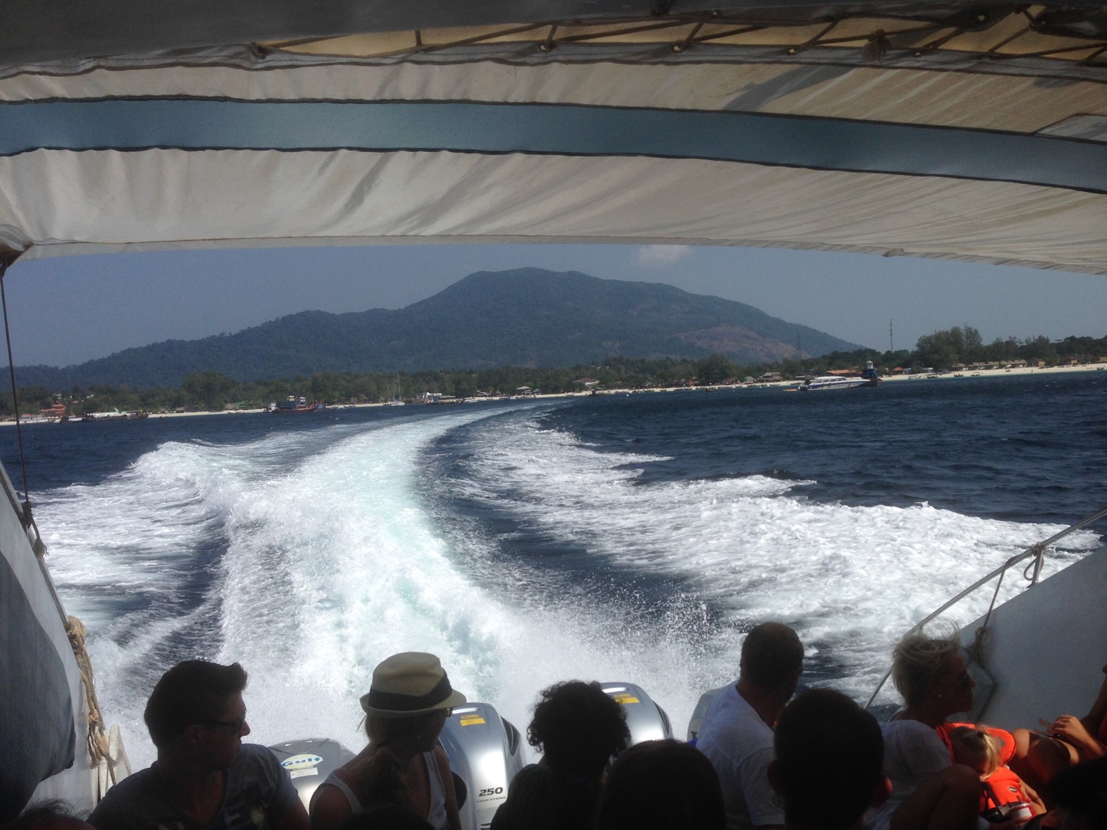 Die 2. Variante wäre, wir bleiben eine Nacht auf Langkawi, fahren mit der Fähre rüber nach Penang, bleiben da 2 Tage und fahren von dort über Kuala Lumpur nach Singapur. Aber noch sind wir ja auf Ko Lipe. Nach fast Null Schlaf und einen kurzen Frühstück habe ich die Pässe zur Immigration gebracht. Die erledigen alles mit den Ein- und Ausreisestempeln und wir bekommen die Pässe in Malaysia fertig wieder. Um 10 Uhr waren wir am Strand und Longtailboote haben uns wieder zur Plattform gebracht, wo das Speetboat auf uns wartet. Der Umstieg war spannend aber machbar. Als es losging, wusten wir, warum es Speetboat heisst. Die Wellen waren zwar nicht hoch aber manchmal ist das Boot leicht abgehoben und dann wieder aufs Wasser geknallt. War echt funny und für uns Landhasen ein kleines Abenteuer.