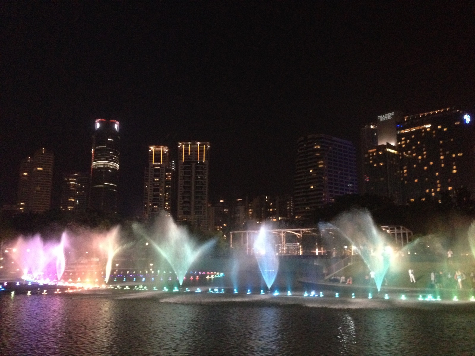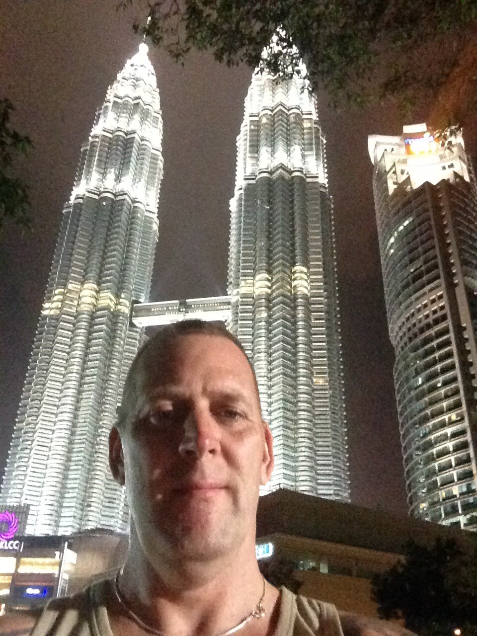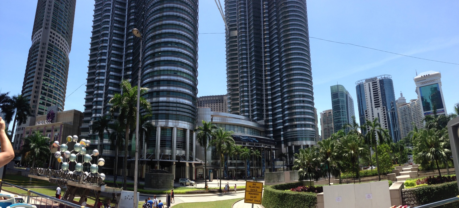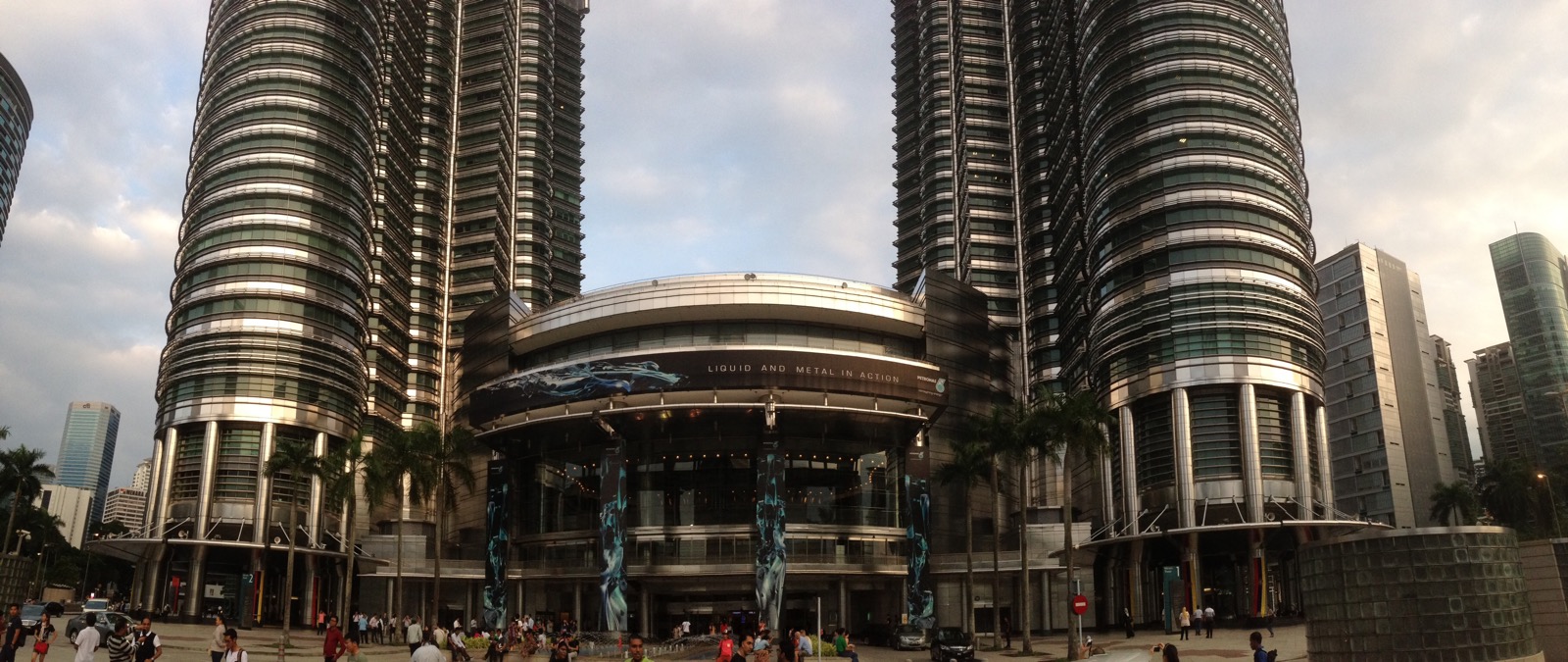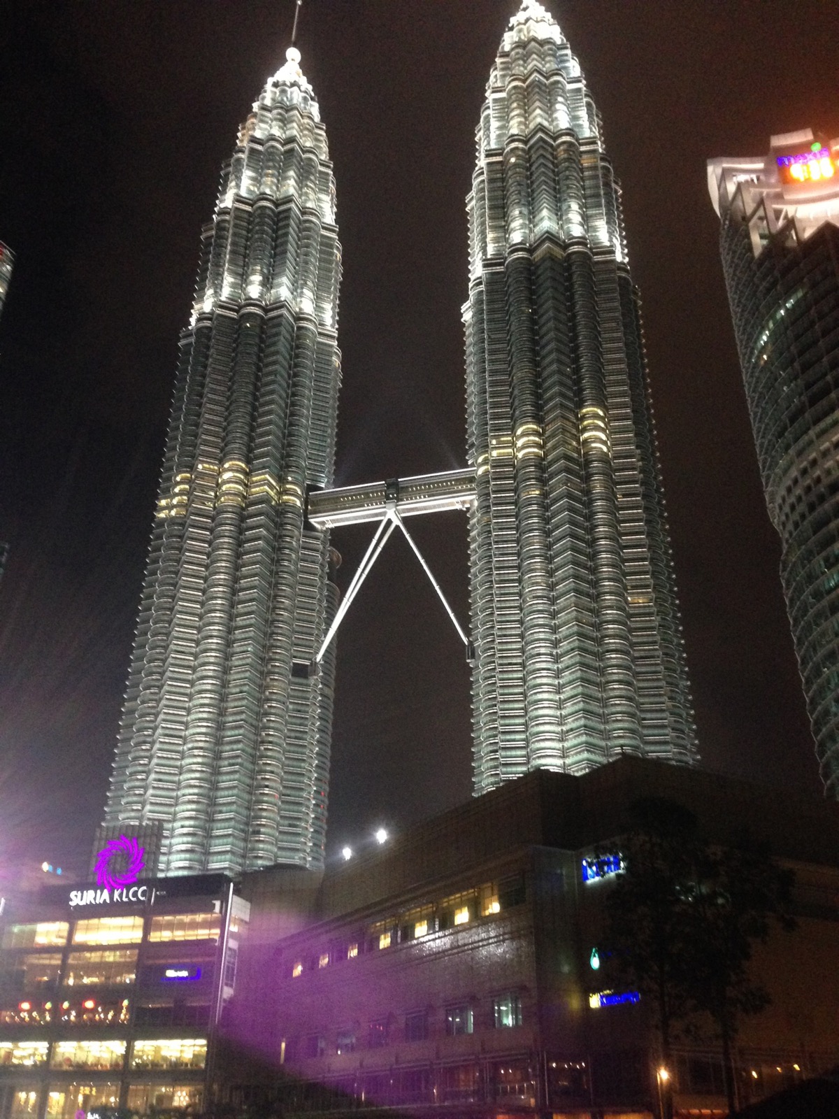 So sind wir ein bisschen mit der Monorail gefahren ein bisschen zu Fuß gegangen und sind dann bei nachlassenden Tageslicht in die Twin Towers rein. Ich wollte noch ein paar Fotos von den Türmen beit Tag und ein paar bei Nacht machen. Leider ist gerade der Park vor den Türmen gesperrt und man kann nicht weit genug weg gehen um ein schönes Foto zu bekommen. Wir sind dann erstmal rein. Ein bisschen umgeschaut. Immer ein belustigendes Lächeln bekommen als ich nach Größe 46 gefragt habe. Dann demotiviert ins Food Court gegangen und eine kleine Malzeit zu uns genommen. Mittlerweile war es dunkel geworden und wir sind raus gegangen um noch die Towers bei Nacht zu bewundern. Genau in dem Augenblick, als wir den Ausgang passiert haben, kommt ein Platzregen von oben. Schnell noch ein Foto gemacht und rein ins Taxi. Sind dann mit ner Büchse Bier und ein Sixpack Donuts aufs Zimmer.