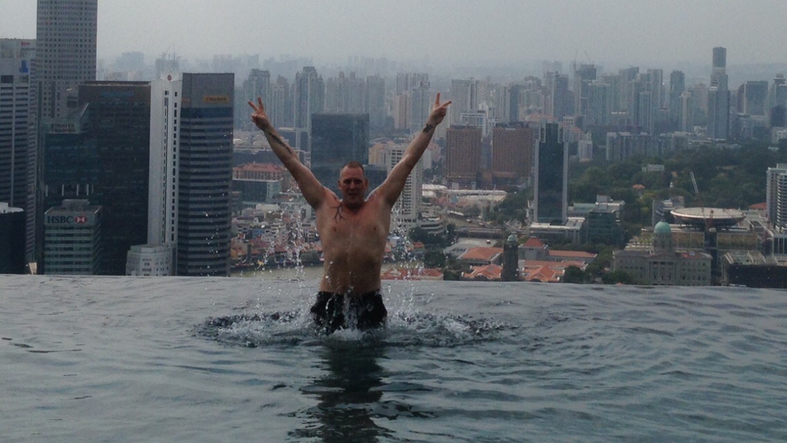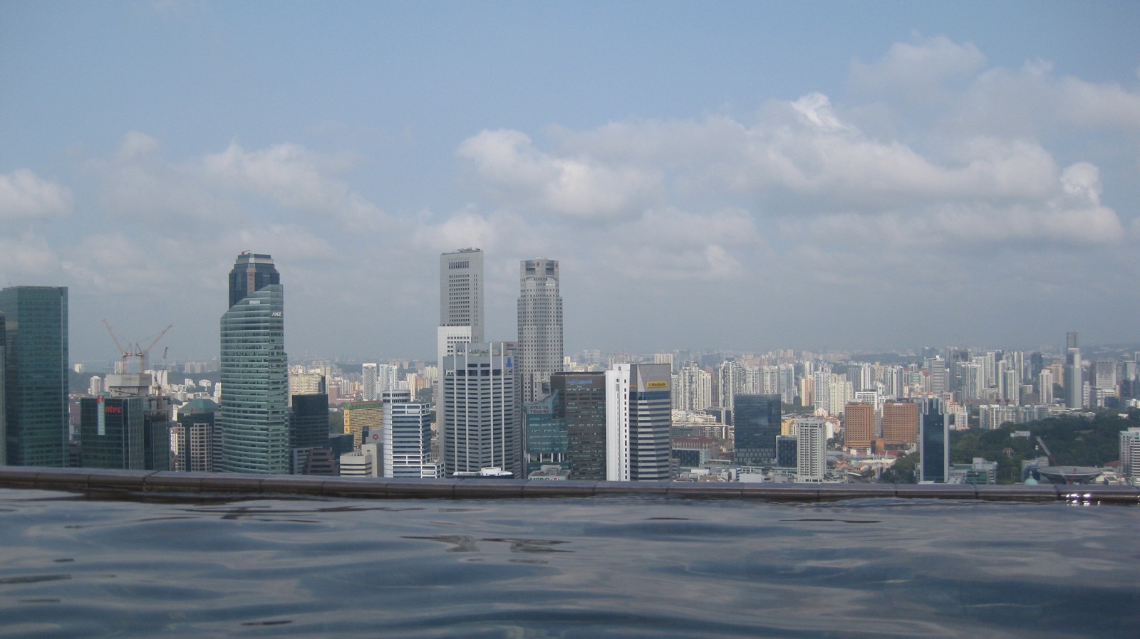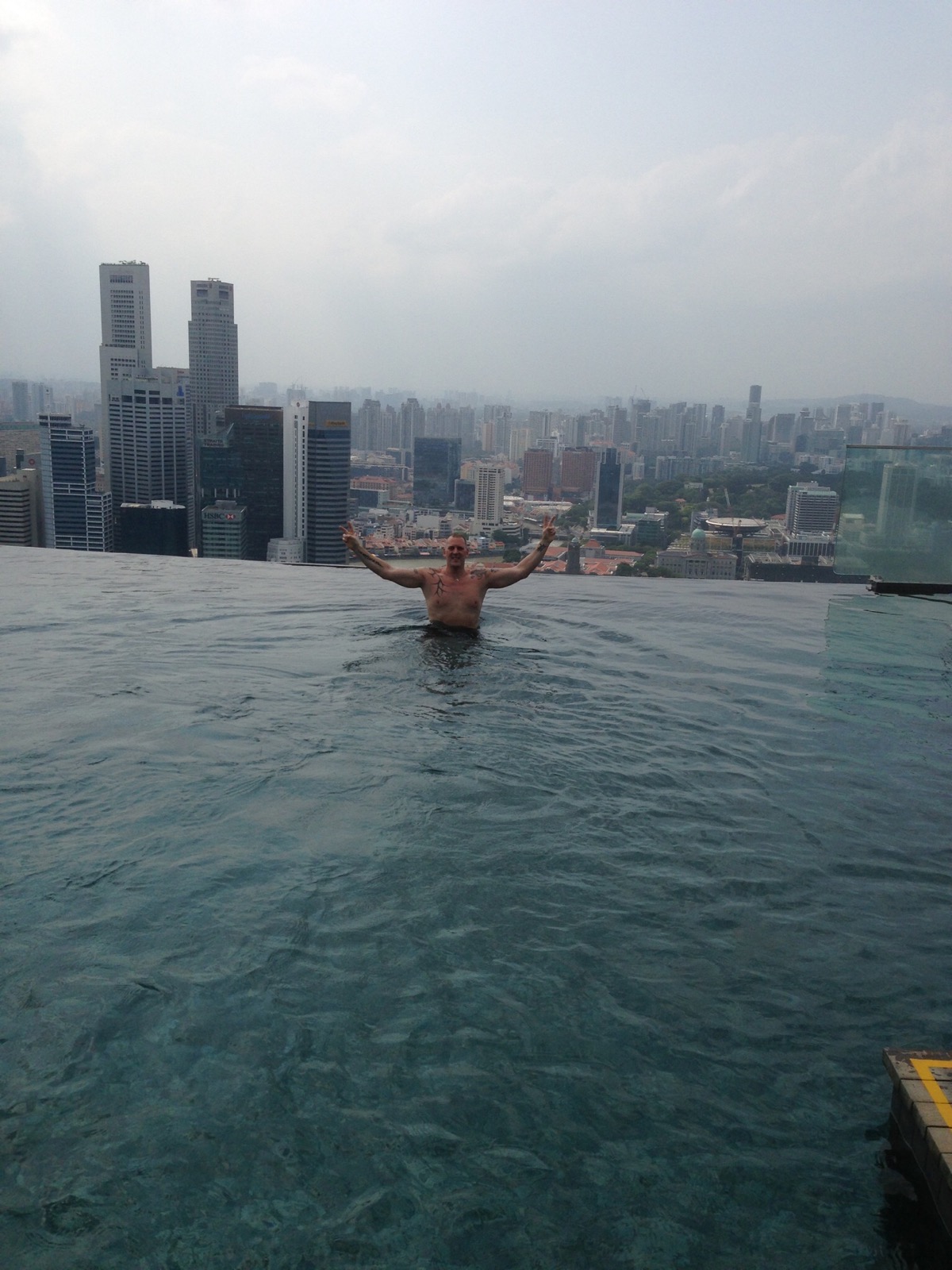 Das was wir zu sehen bekamen war einfach umwerfend. Man kann nicht Beschreiben was in einem bei diesem Ausblick vorgeht. Wir haben uns 2 Liegen geschnappt und haben erst mal alles kurz wirken lassen. Dann musste ich aber ins Wasser. Nach vorne zum Poolrand und über Singapur gucken. Es war der Beste Blick den man haben kann aber auch das kälteste Poolwasser indem ich je war. Heizen die den Pool nicht? Es weht aber auch ne steife Brise dort oben.