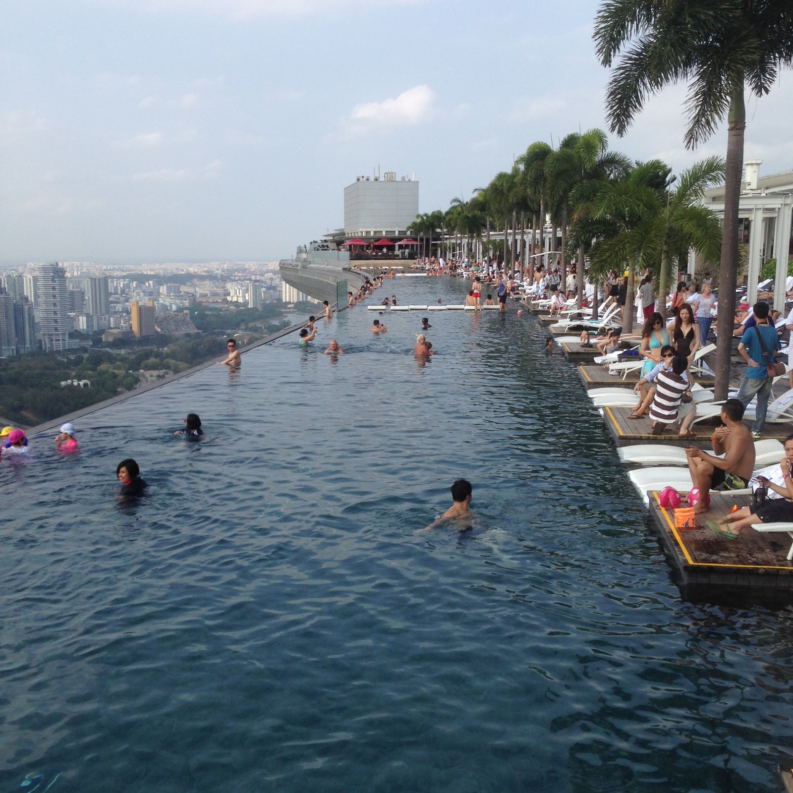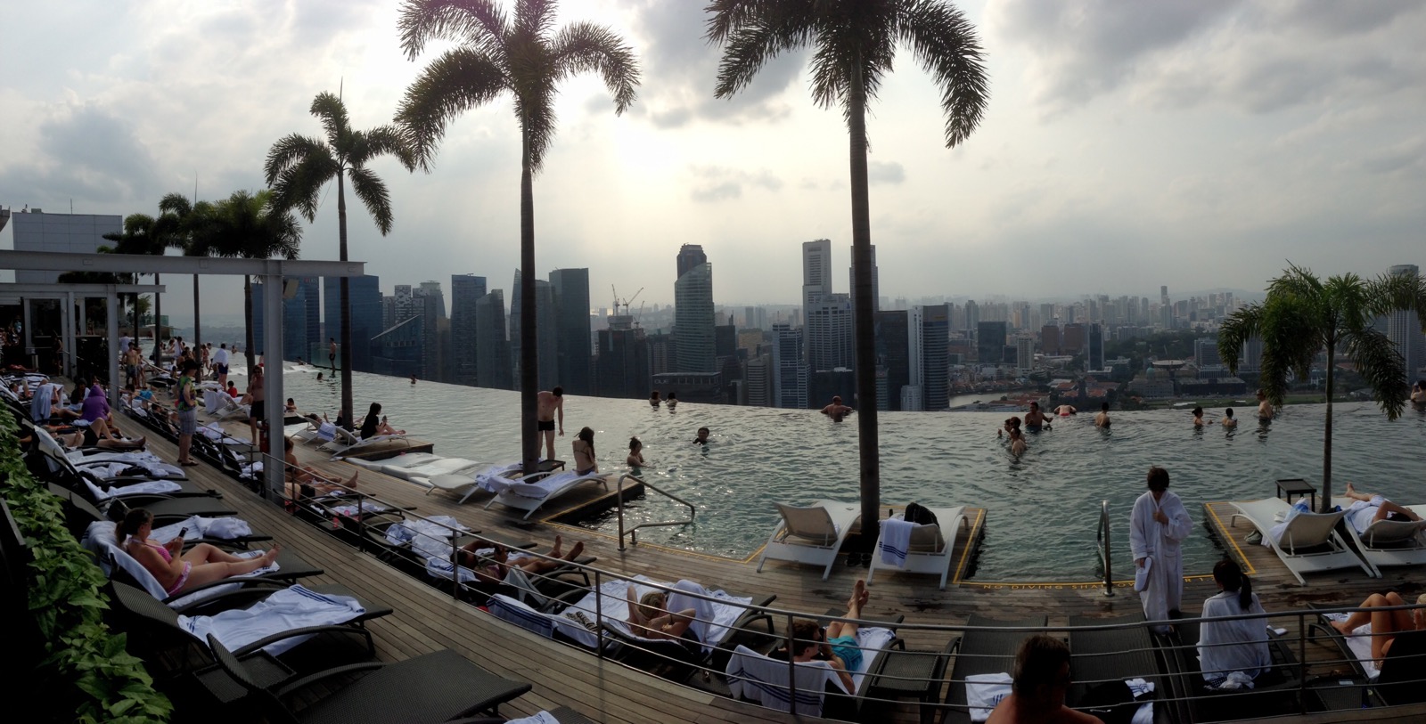 Wir wollten uns einen Wunsch erfüllen und im Marina Bay Sands wohnen. Vor allem wegen dem berühmten Pool auf dem Dach. Als wir ankamen in der Lobby stand eine lange Schlange vor dem Check In. Ich habe erst mal das Gepäck auf Seite gestellt und Bekky hat sich schon angestellt. Da kam ein Angestellter auf uns zu hat unsere Reservation angeschaut und meinte zu uns und einen andern Paar, das wir ihm folgen sollten. Er führte uns zum VIP Check In. So stand ich mit meinem ollen Rucksack auf dem Rücken beim VIP Check-In. Geiles Gefühl. Mit unserer Reservierung war alles in Ordnung und nach wenigen Minuten standen wir im 36. Stock vor dem Zimmer. Wir hatten ein Eckzimmer im 2. Tower bekommen mit eine tolle Aussicht auf die Gardens by the Bay. Das Zimmer war super und hatte ein tolles Bad. Dann aber erst mal hoch zum Pool.
