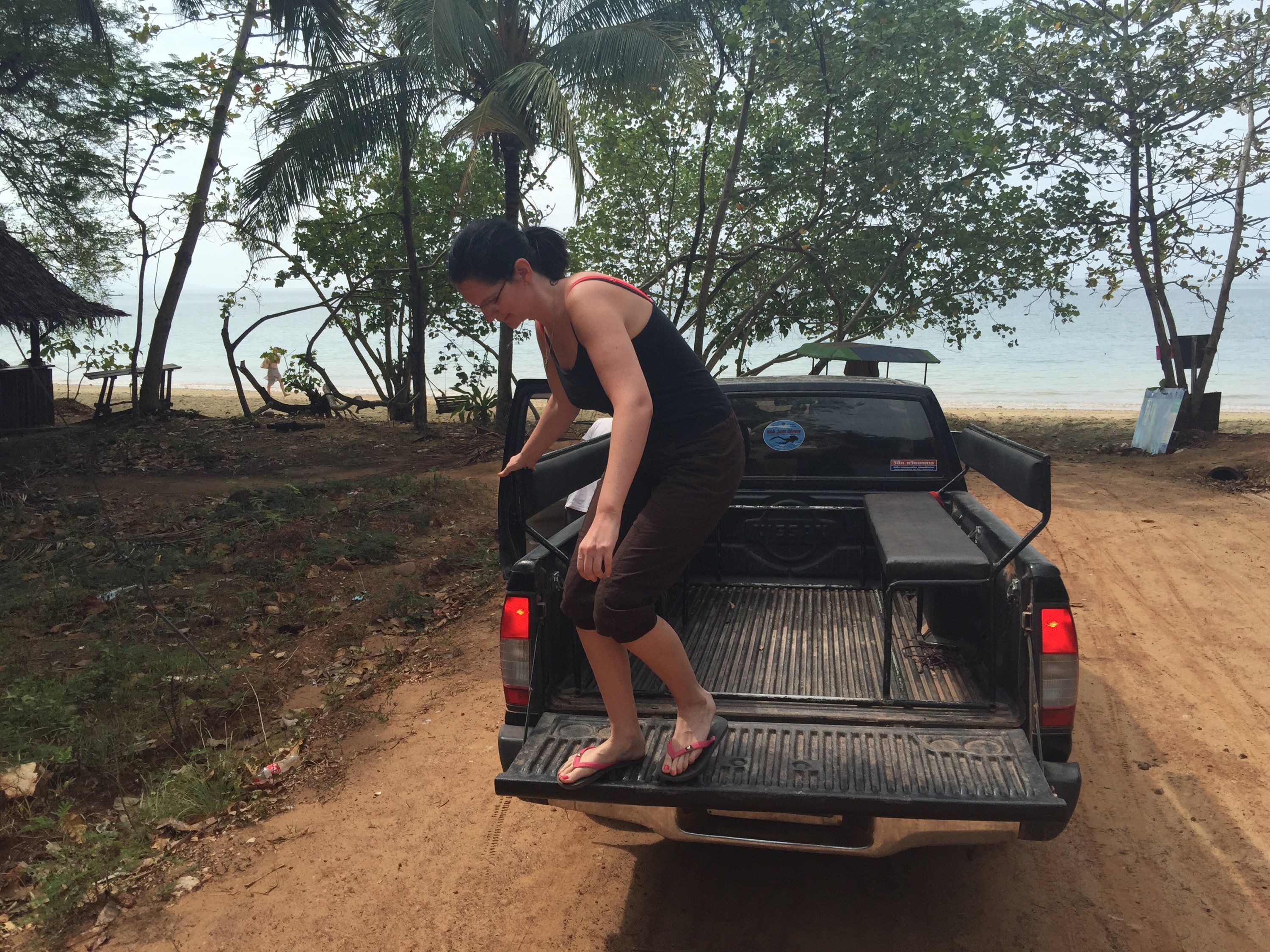 Das Auto zum Pier kam ein paar Minuten später. Die Pritsche war schon halb voll mit Leuten und außer uns wurde noch ein Pärchen mitgenommen. Man glaubt nicht, wieviel Personen auf so ein Pickup passen.