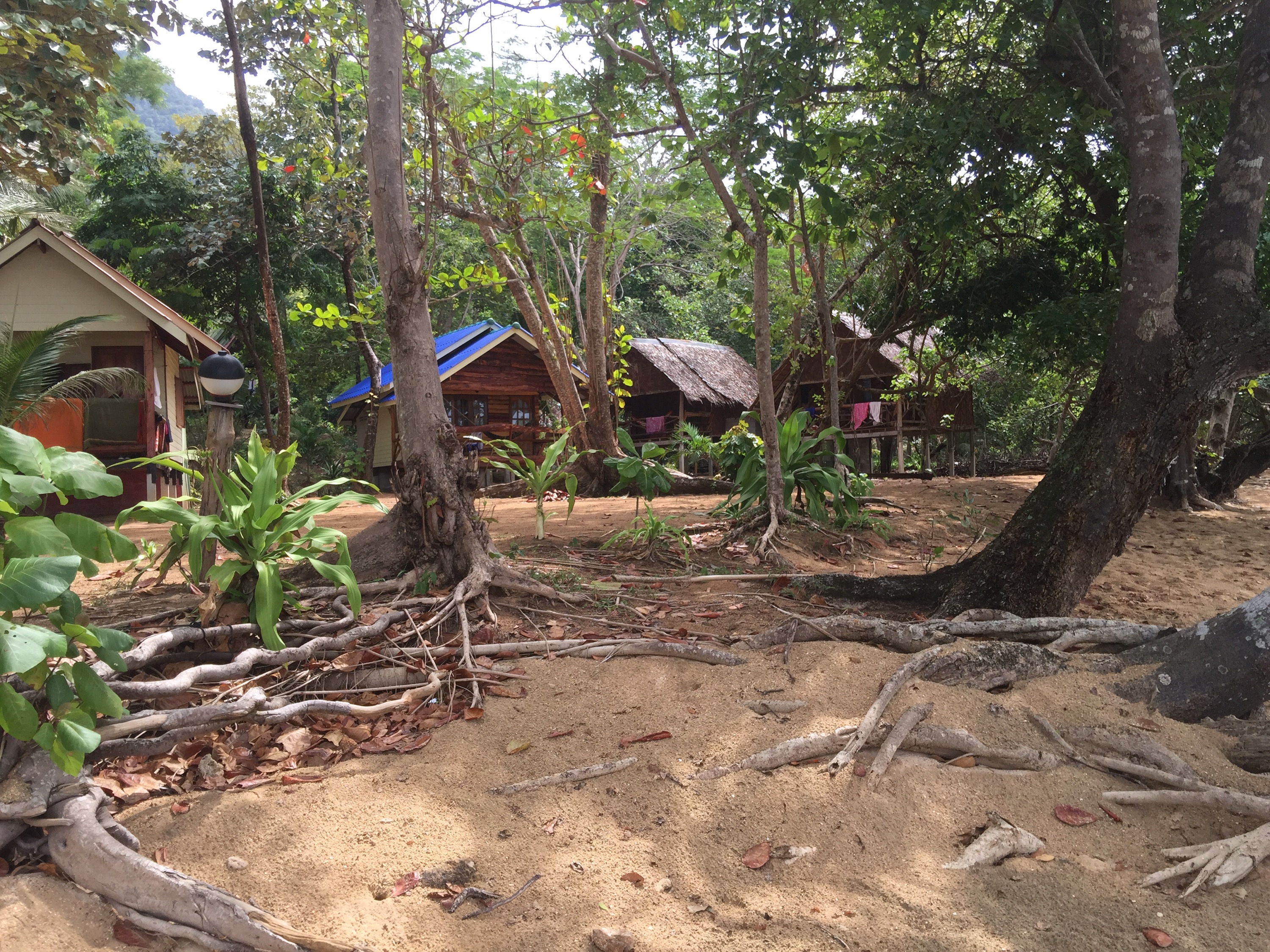 Ko Jum ist eine wirklich entspannte Insel. Dagegen ist sogar Koh Phangan voll die Touristenhochburg. Unser Bungalow vom Andaman Beach Resort ist am nördlichen Ende des Andaman Strandes. Der Strand selber ist knapp 2 km lang und am anderen Ende befinden sich wenige weitere Bungalowanlagen. Neben uns gibt es noch zwei kleine Resorts. Dazwischen ist nix außer Natur. Das Dorf Ko Jum ist auch ca. 2 km entfernt und sehr übersichtlich, man ist in 5 Minuten durch gelaufen.