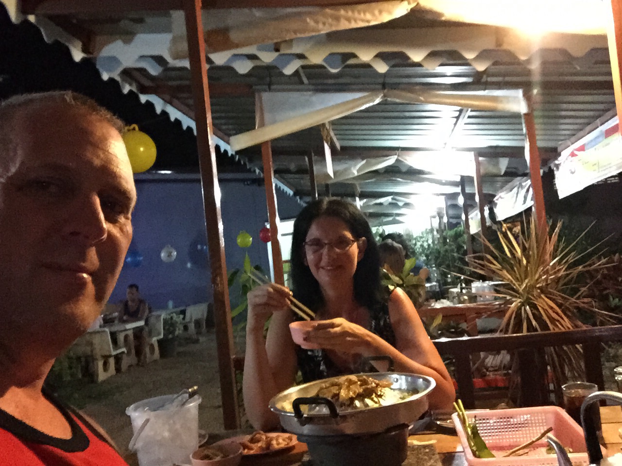Wir sind am Sonntag angereist und haben noch die letzten Reste des Thaiwochenende mitbekommen. Jetzt ist es angenehm ruhig. Die Preise in den Restaurants und Ständen erinnern uns noch an unsere ersten Jahre in Thailand. Man bekommt noch für ca. 1€ ein kpl. Essen.