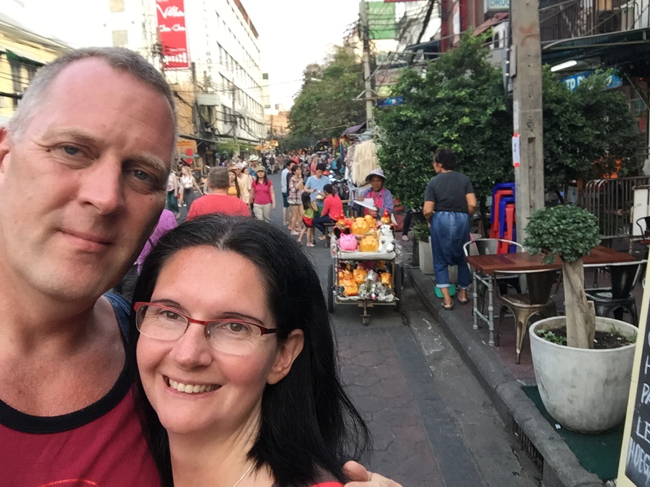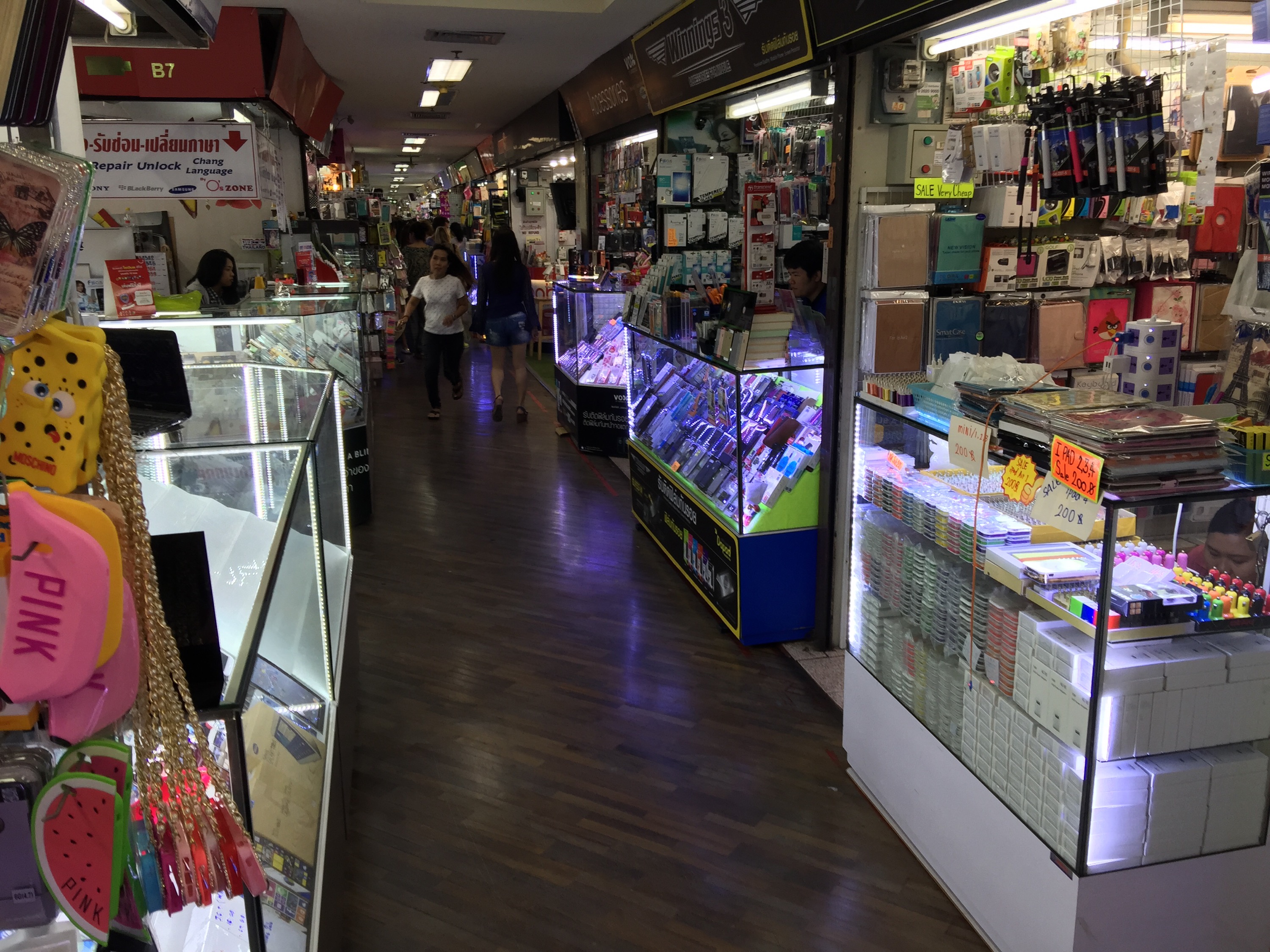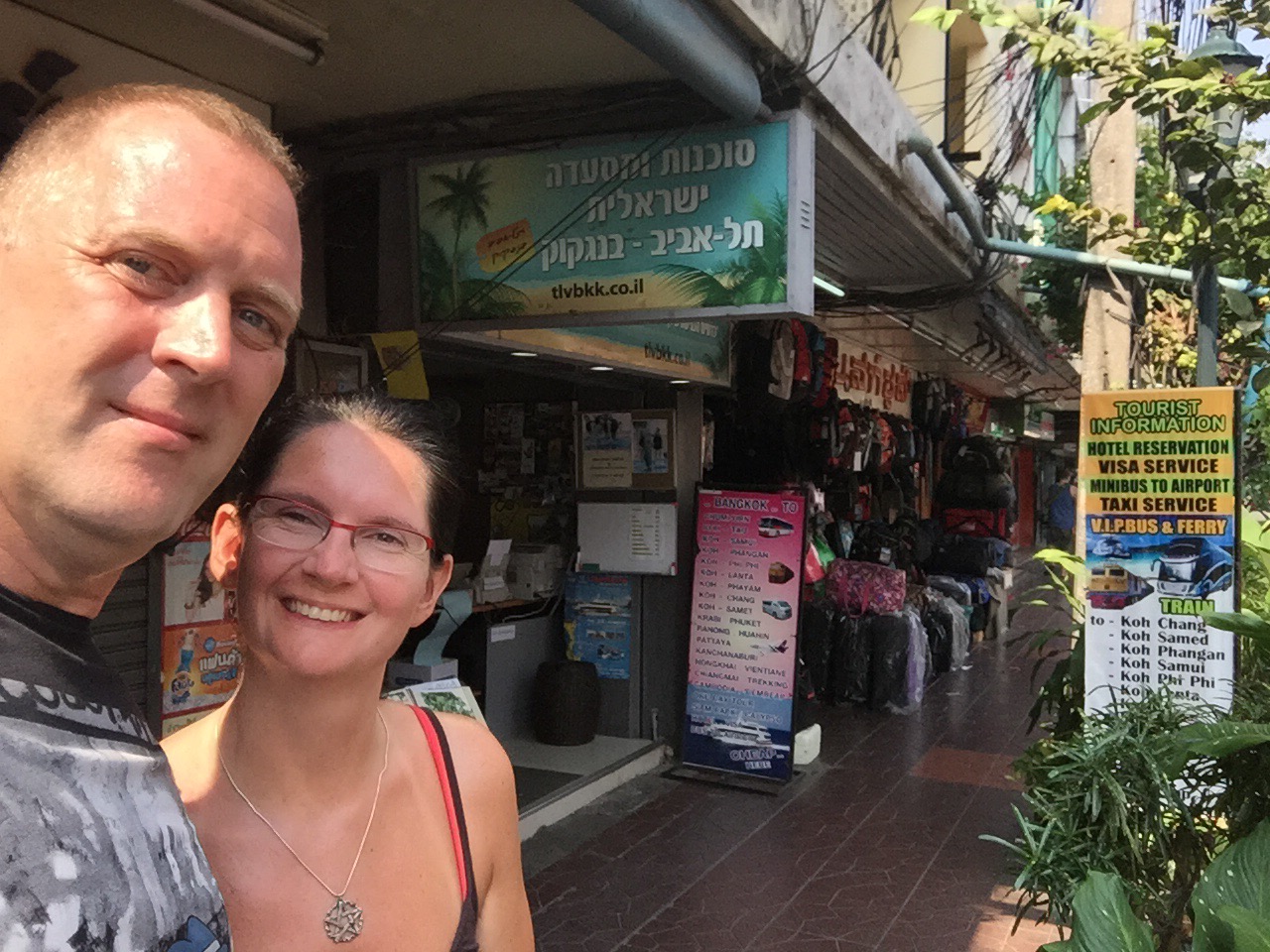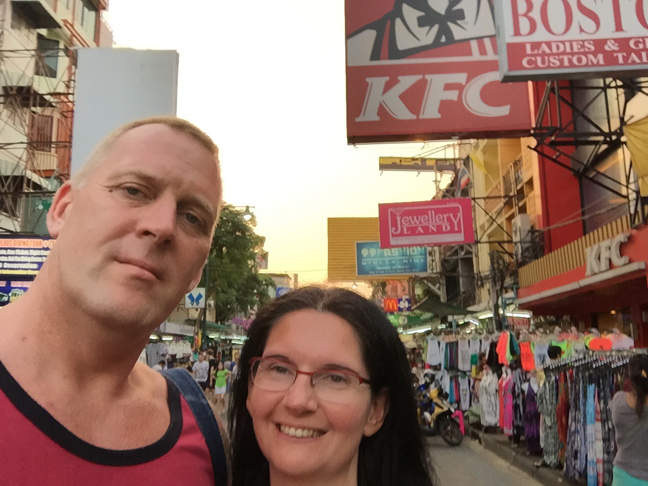 Also mit leeren Einkaufstüten ins MBK gefahren. Dort, in der 4. Etage, die für Handys und Zubehör reserviert ist haben wir Hüllen für unser iPhones gefunden. Das war ein Kampf. Es gibt hunderte Läden mit Hunderte Hüllen. Nach 2 Stunden hatten wir keinen Kopf mehr für Klamottenshoppen. Vor der Tür ein Tuk Tuk geschnappt, Preis ausgehandelt und dem Fahrer gesagt, das er ohne Stopp an irgendwelche Läden, von denen er Provision bekommt, uns zur Khaosan fahren soll. Hat auch vorzüglich, bis auf Herzausetzer durch die rasante Fahrt und Atemnot durch Abgase, geklappt.