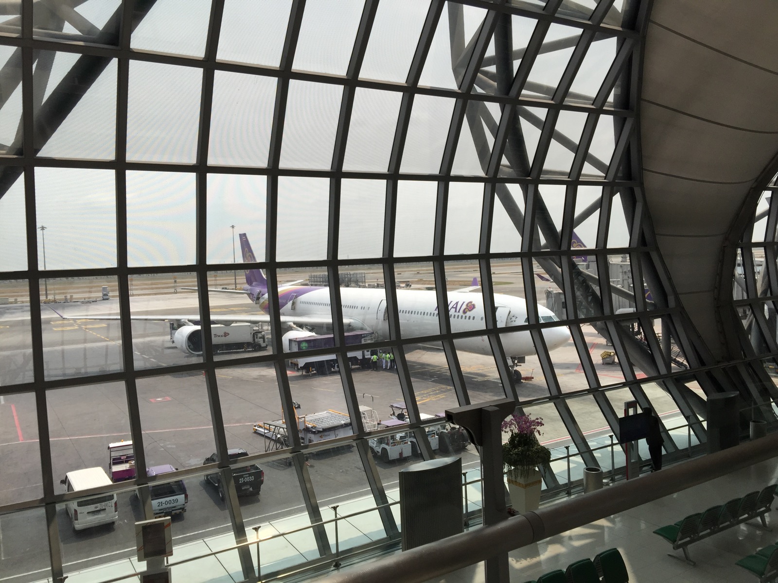 Beim Einchecken habe ich wie immer nach einem Platz am Notausgang gefragt. Und Bingo, hat wieder geklappt. Obwohl uns ein bisschen bange war. Die am Checkinschalter hat uns gefragt ob wir Englisch sprechen, was wir bejaht haben. Dann hat sie uns die Tickets ausgestellt. Als alles gebucht war, sagte sie, das Thai Airways ihre Richtlinien verschärft hat und wir sehr gut Englisch sprechen müssten sonst machen die uns Ärger und setzen uns irgendwohin. So Perfekt ist unser Englisch garnicht. Aber beim Plätze aufsuchen hat es keinen interessiert welche Sprache wir sprechen. So hatten wir wieder unsere bereits obligatorischen Sitzpätze am Notausstieg und der dritte Sitzplatz ist auch frei geblieben. Dieses mal sind wir mit dem A380 geflogen, der ist zwar mit einer Stunde Verspätung abgeflogen aber so einen sauberen Start und leisen Flug haben wir auch noch nicht gehabt. Auch der Service und das Essen waren mal wieder wie es sich bei Thai Airways gehört.